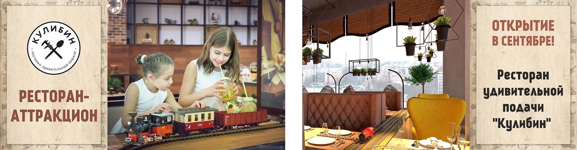 Кулибин – совсем не обычный ресторан. Доставка блюд здесь происходит фирменным поездом прямо за Ваш столик. В меню – блюда домашней, европейской и русской кухни.